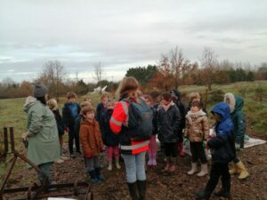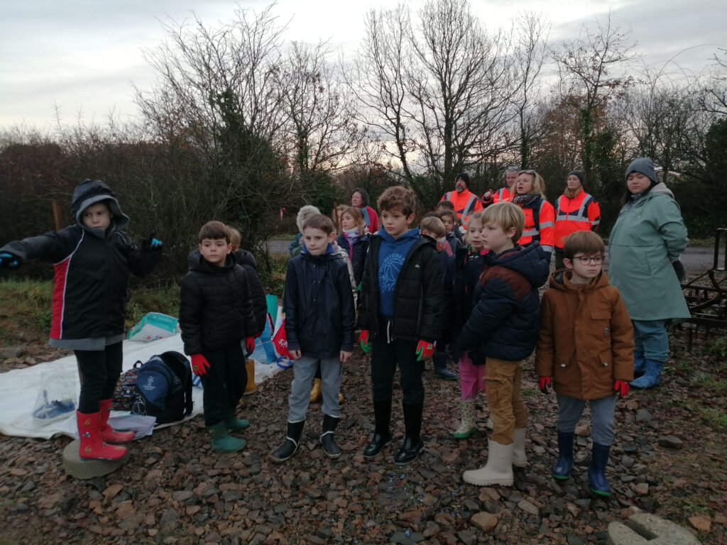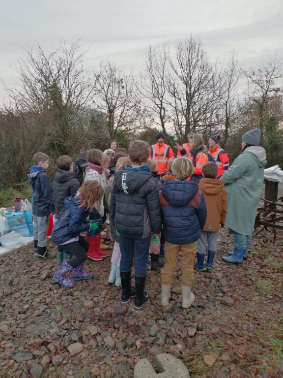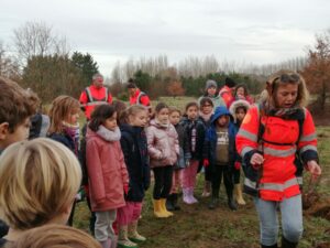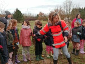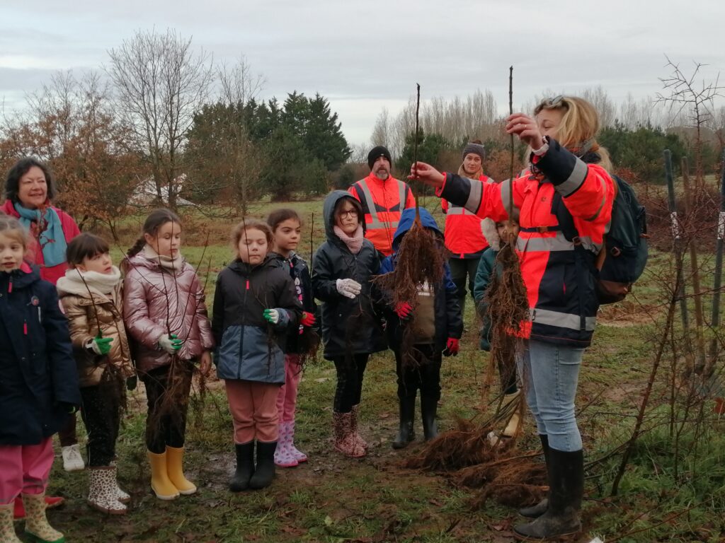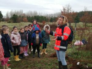 Justine nous a accueillis près de la déchèterie. Elle a rappelé aux enfants les différentes étapes pour une bonne plantation et a distribué à chacun son arbre : chêne, érable, sorbier, frêne, aulne.